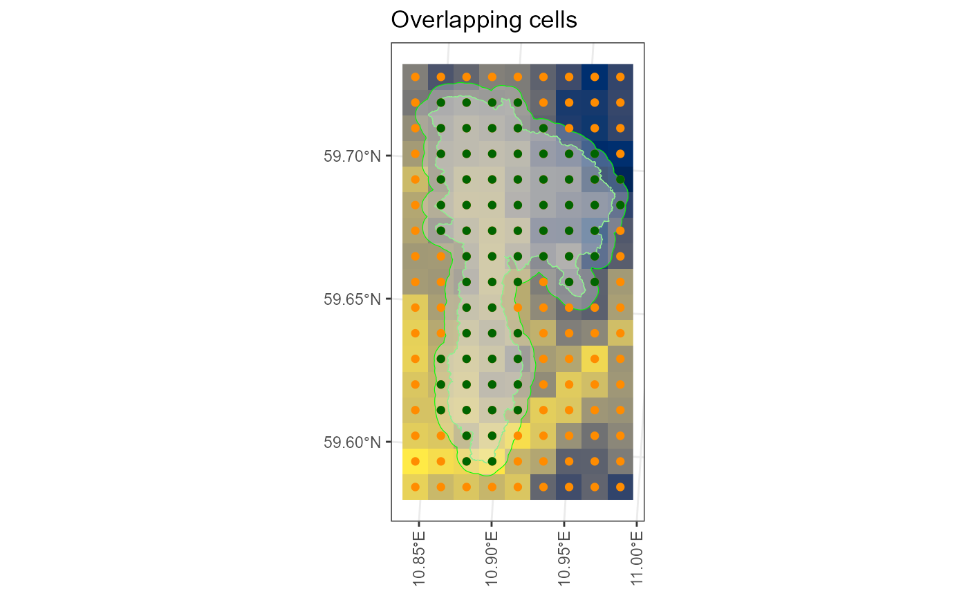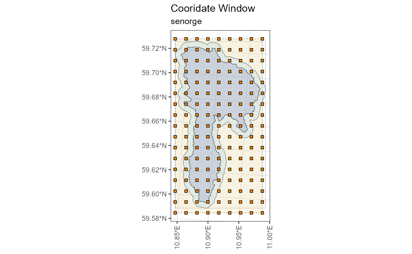 We can use the same function as for the MET Nordic dataset for SeNorge, we just need to adjust the “project” parameter. We will also buffer the shapefile by 500 m to include grid cells just outside the boundaries.