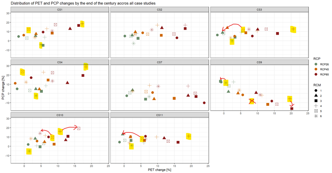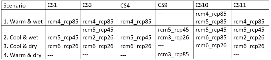 To limit the modelling effort and for illustrative purposes, 3-4 markedly different climate scenarios should be selected from the ensemble of available RCP-RCM combinations based on projected changes in temperature and precipitation by the end of the century (e.g. a ‘cool & dry’, ‘cool & wet’, ‘warm & wet’, ‘warm & dry’). The term ‘cool’ refers to low levels of warming, as all available scenarios project rising temperatures. Mikolaj did such an analysis for CS1. An easy option would be to use this selection (rcp26-rcm6: cool & dry, rcp45-rcm5: cool & wet, rcm85-rcm4: warm & wet, no scenario was found representing warm & dry), better would be to do the same analysis for your case study - please ask Mikolaj for more details.